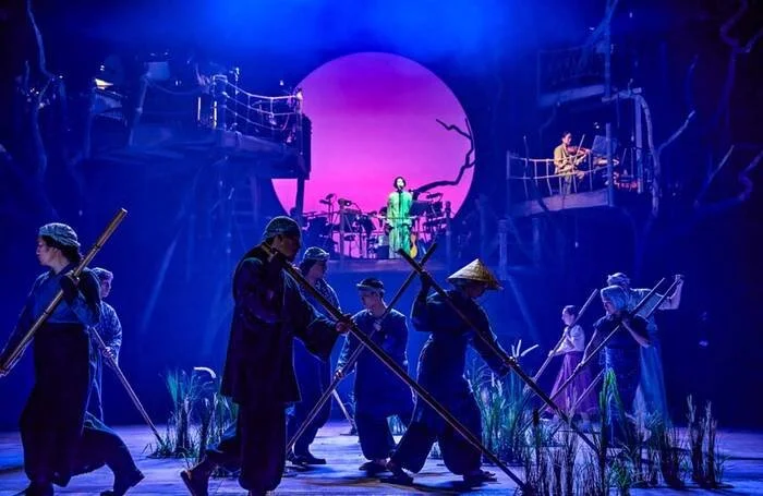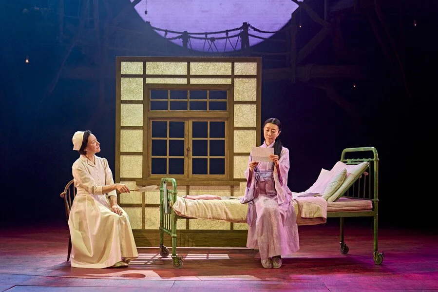 One particular tool that stood out to me as particularly fantastic- and I believe will stay with me for years to come- was the way props were used to symoblise changing scenes. Specifically how an entire rice farming field was brought to the stage. Ensemble cast members entered from the stage wings walking backwards, in a rythmic step they dragged under their feet a mat of grass (it was rice growing but grass is a way to describe it visually)
