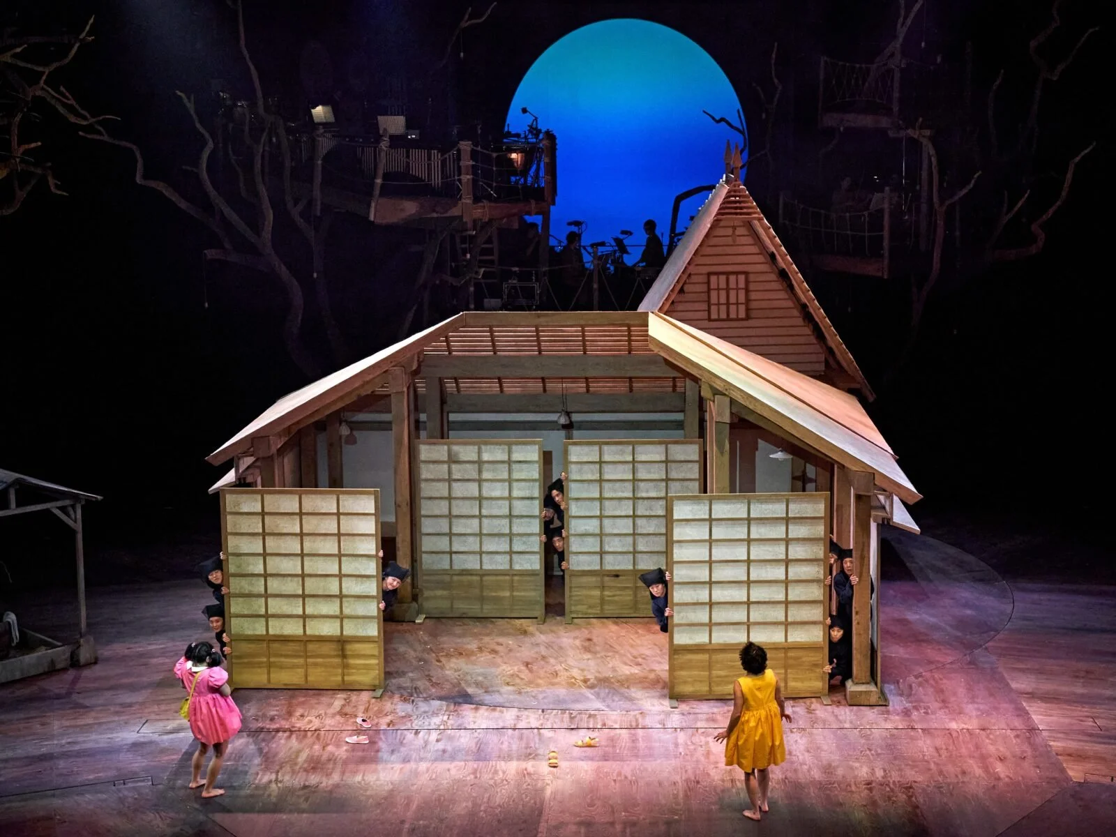 The family’s house was the main set piece that was transformed to apply to other scenes where possible. It also rotated and was deconstructed at times to show how the childere passed through the rooms and explored the attic for example. I love a set that is interactive and transformative. The permenant structures around the stage being forest branches, and the house being the most common set piece was just the perfect way to communicate the story of Totoro and our connection to nature being such a healing and intertwined relationship.