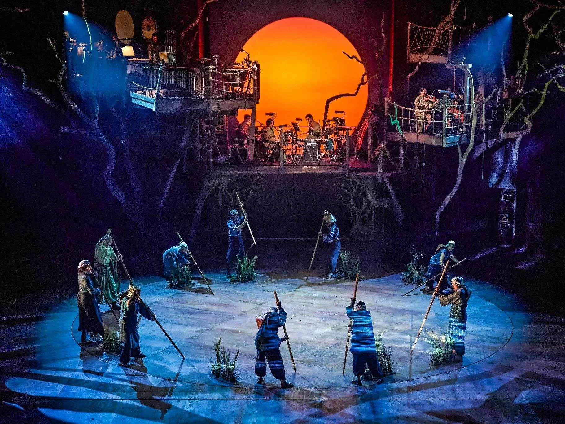 There was a live singer who performed throughout the show, along with treehouse type platforms at either side of the stage and at the back of it, for the orchestra- who played live music throughout.